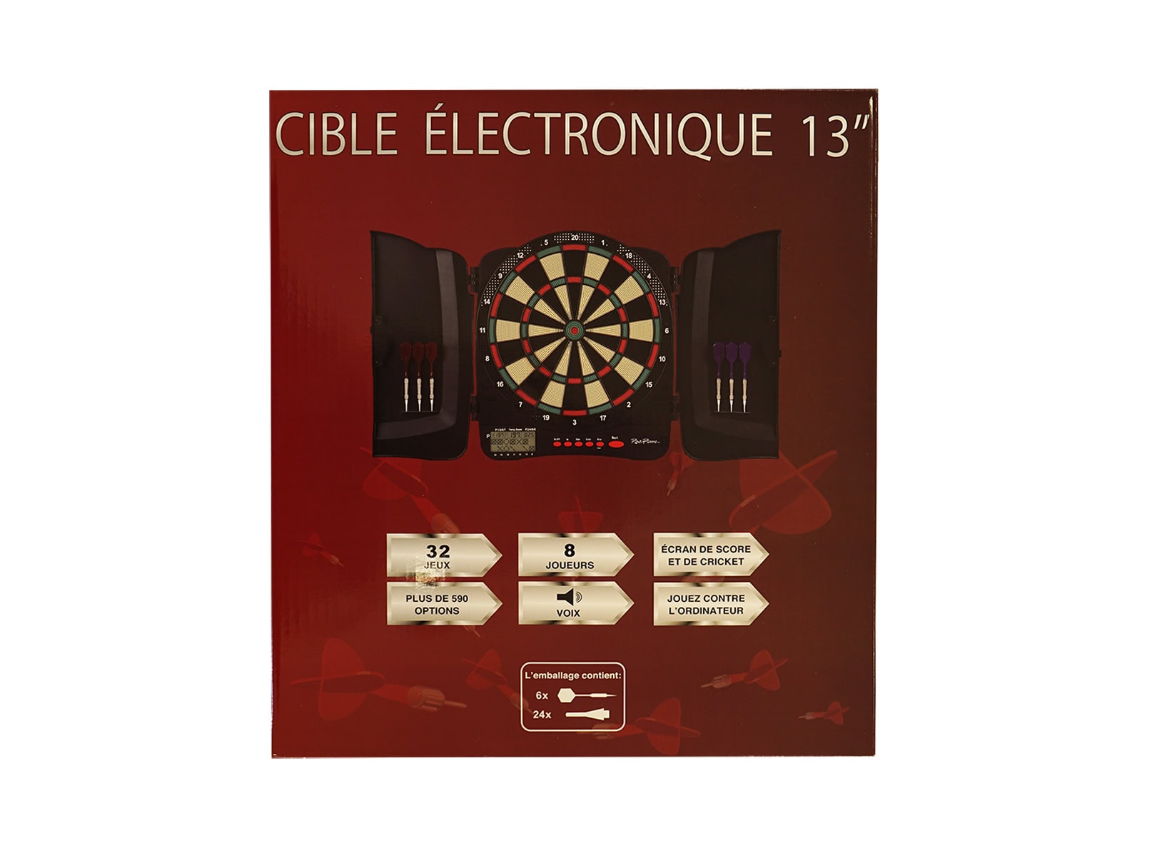 Livré avec 6 fléchettes pointes plastiques, 1 lot de 24 pointes plastiques, notice d’utilisation.